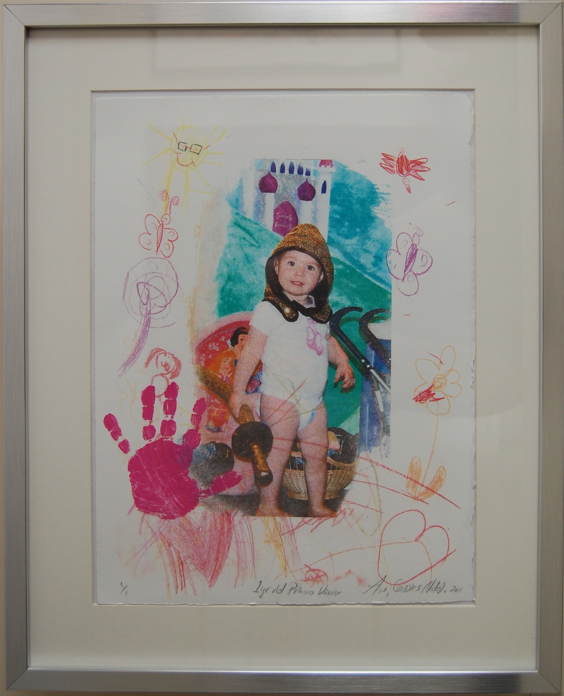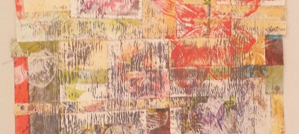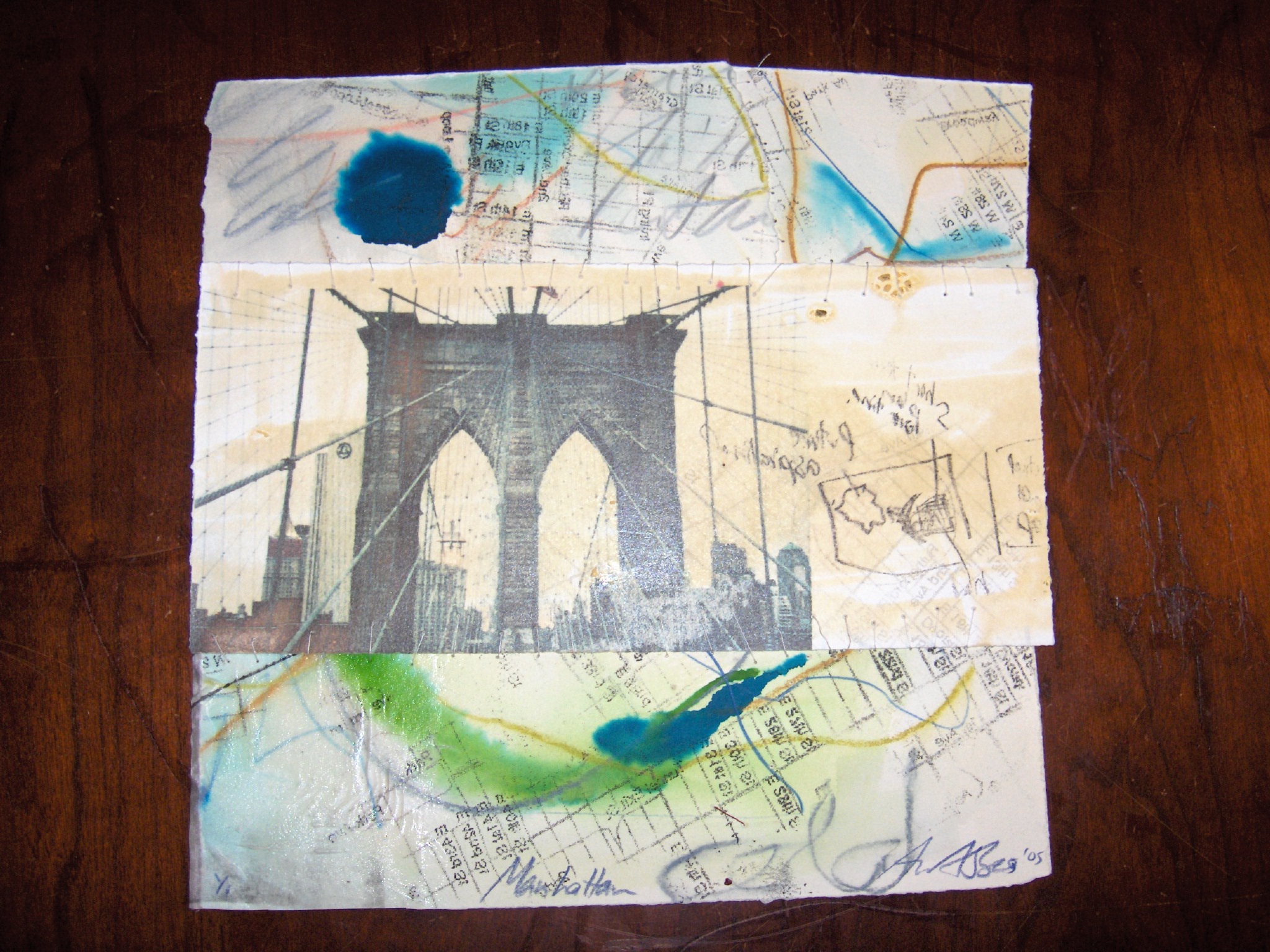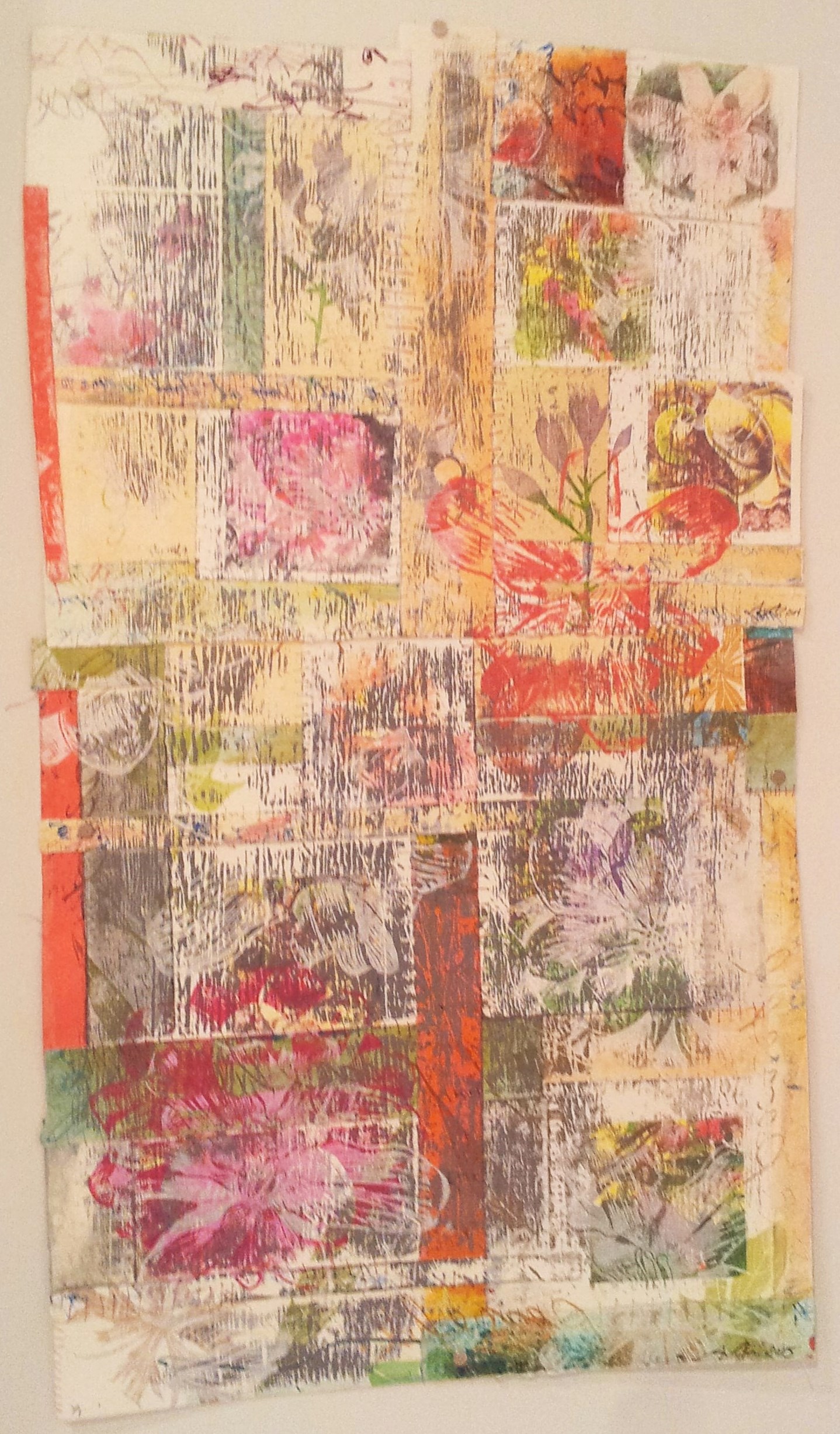The smaller image shown at the top of the page has a collage sewn on to it and measures 16 by 16 inches.