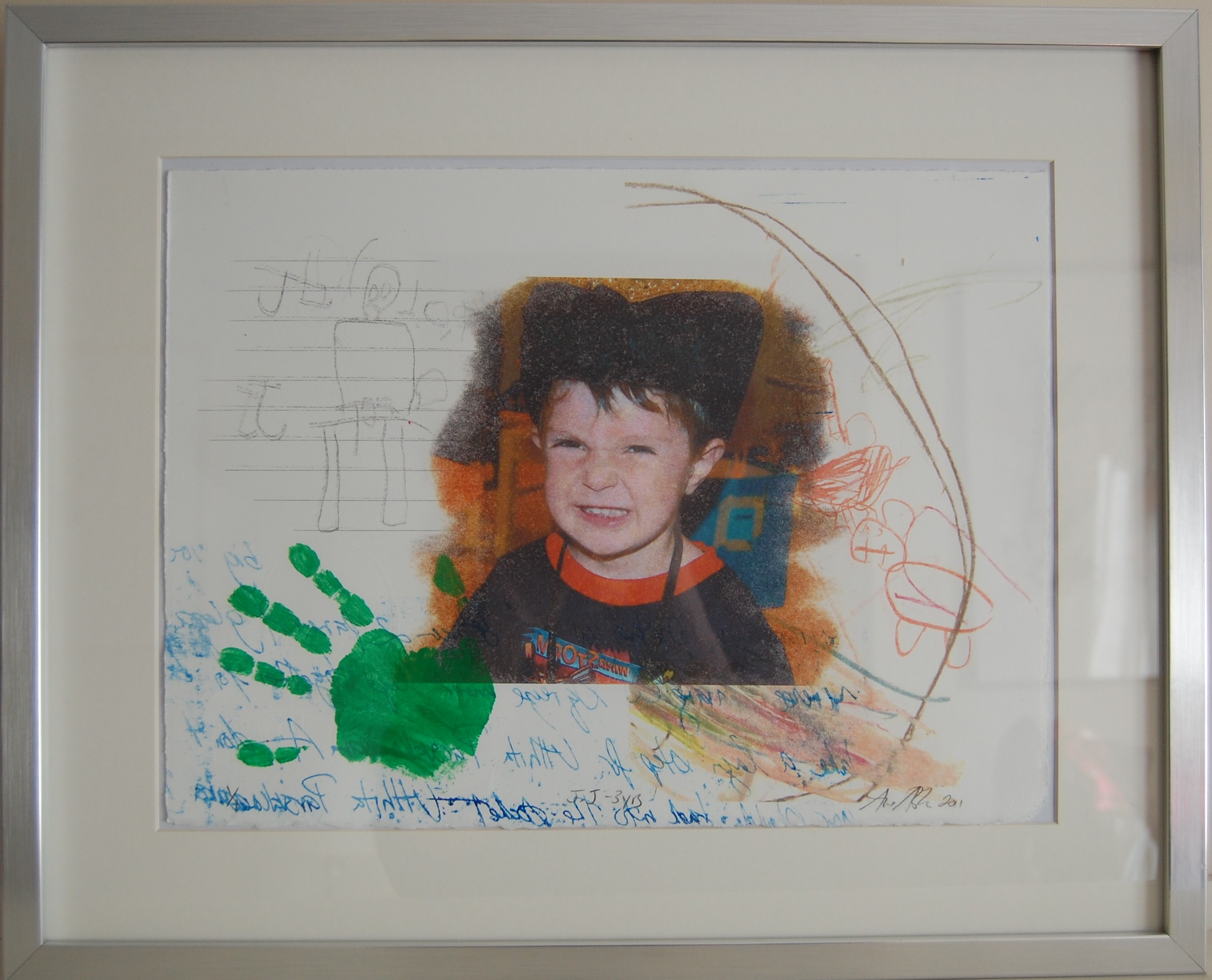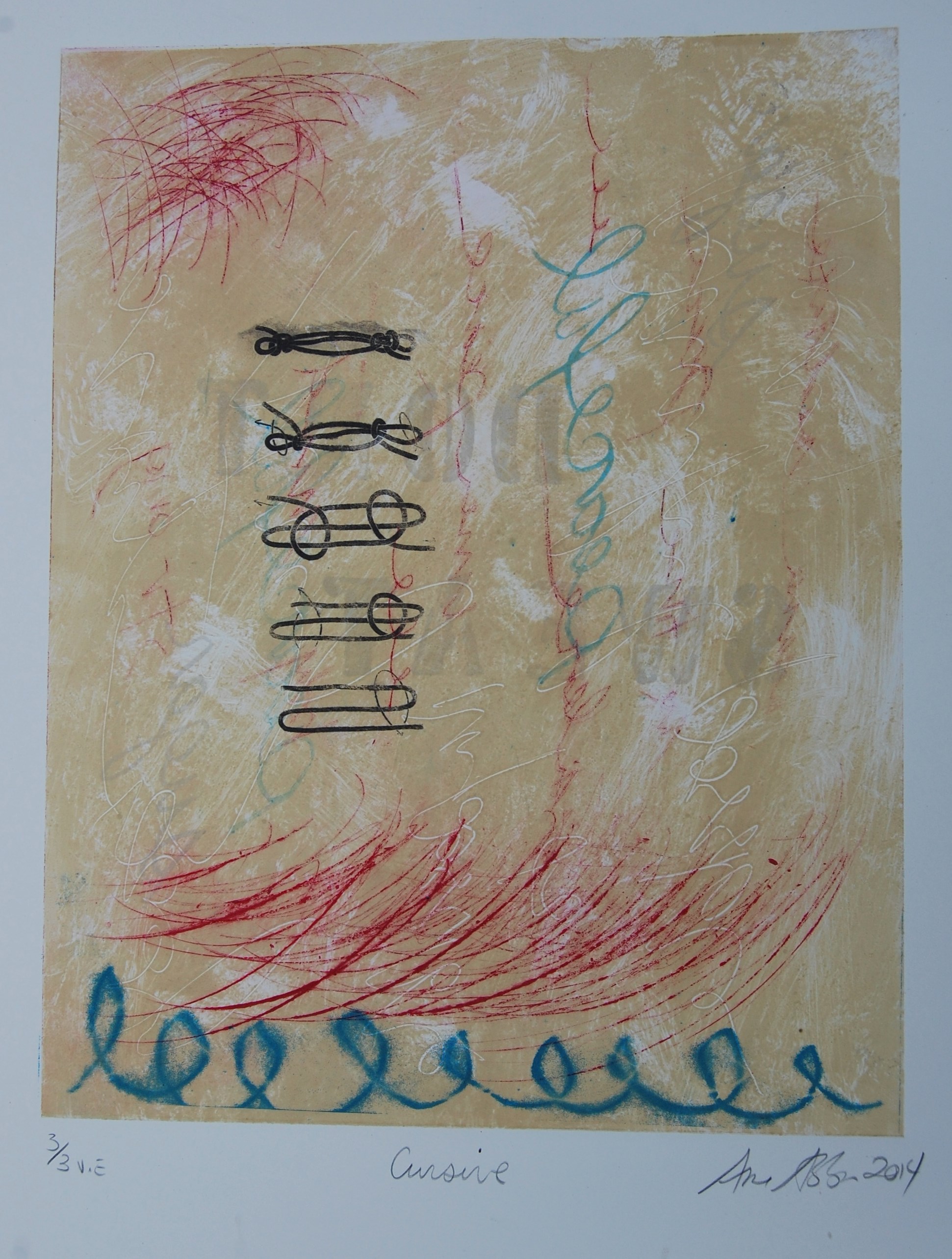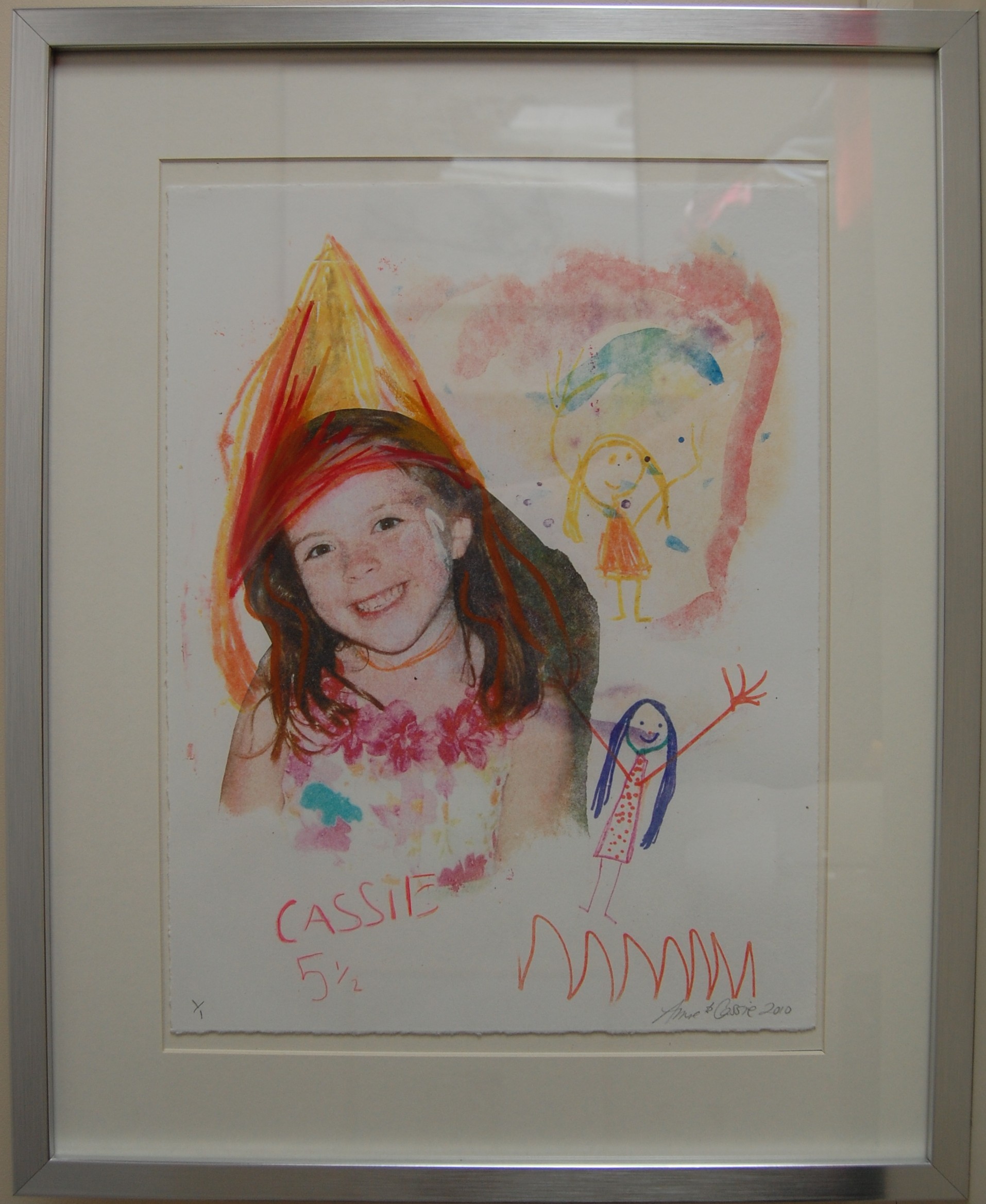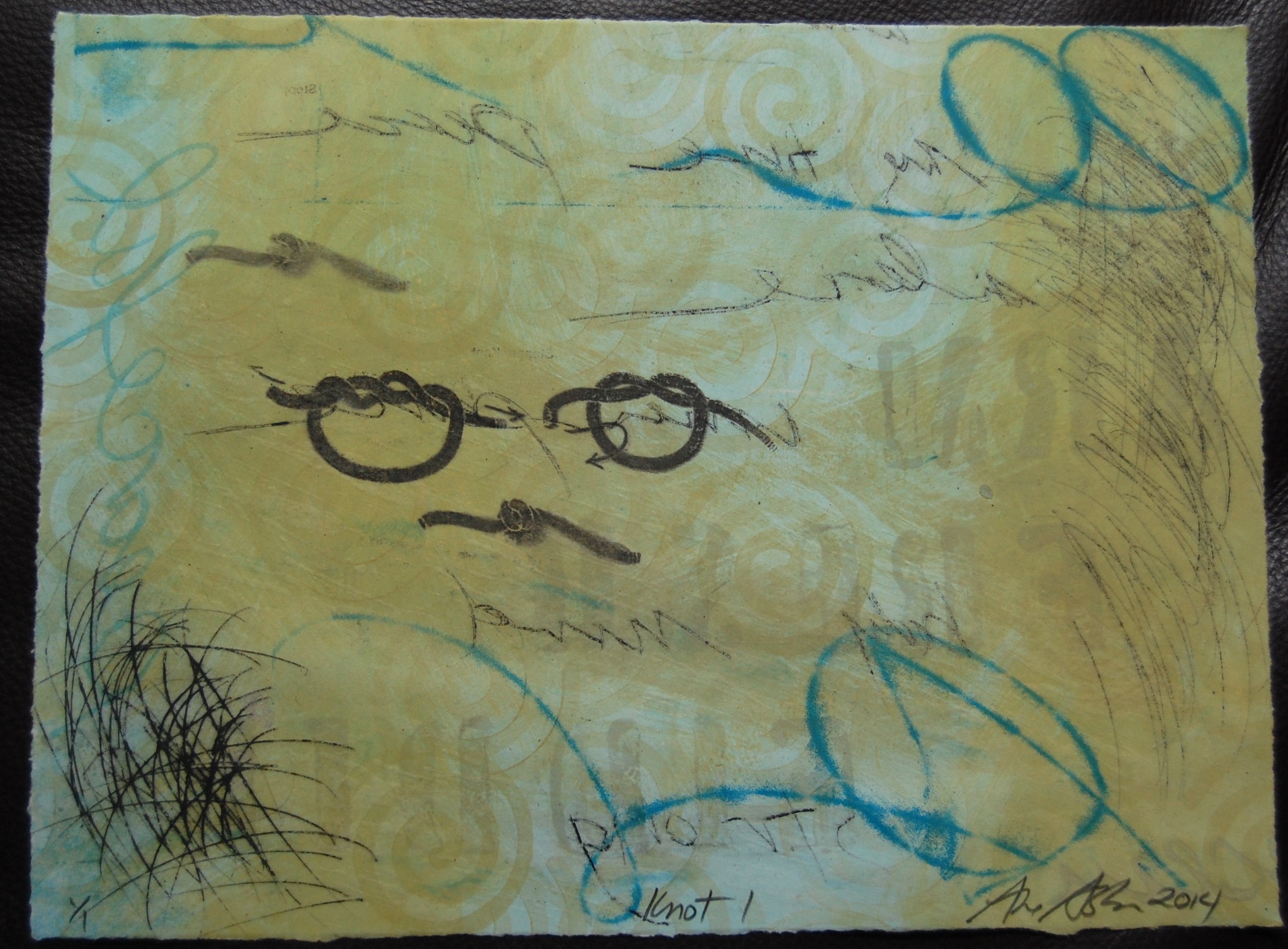 The smaller image shown at the top of the page has a collage sewn on to it and measures 16 by 16 inches.