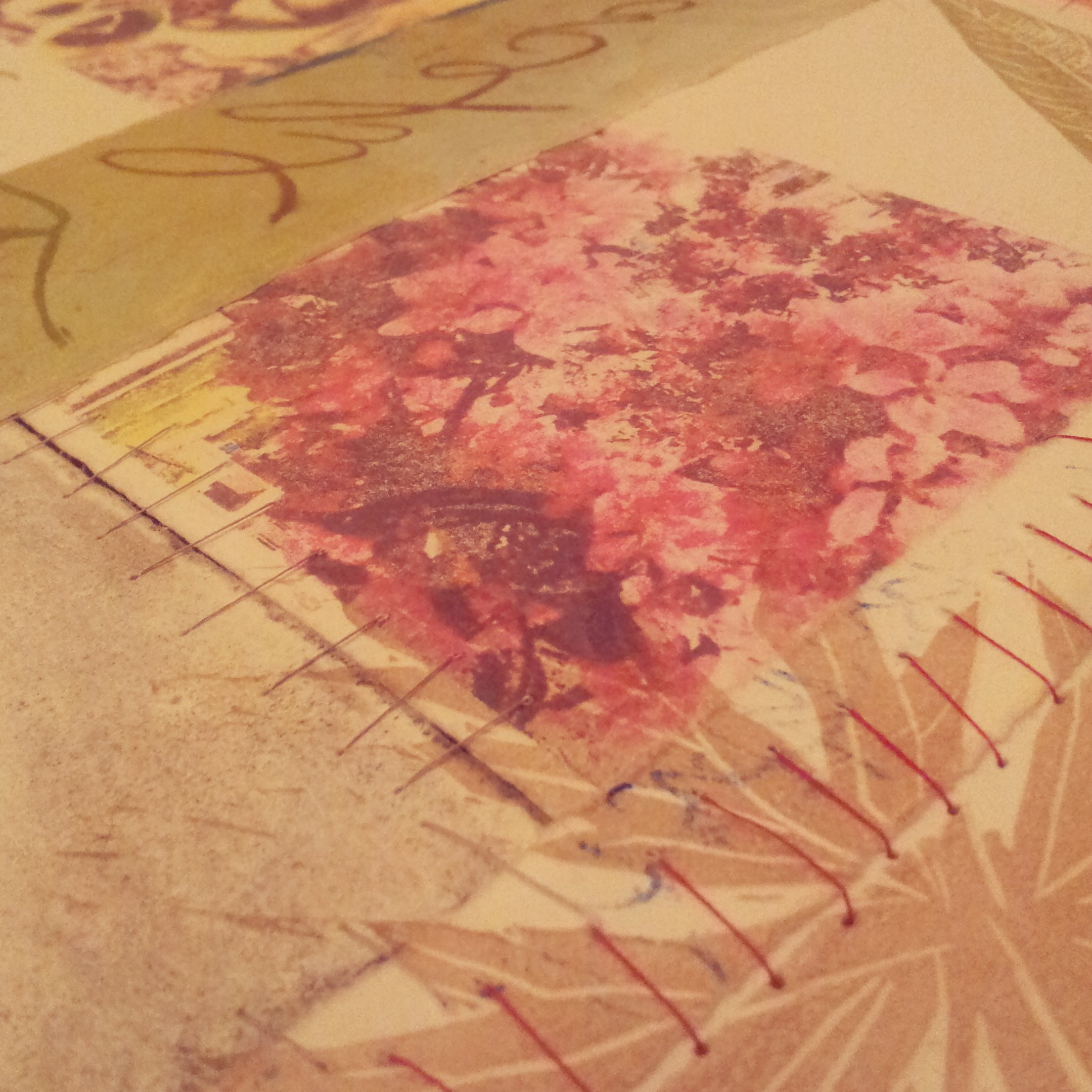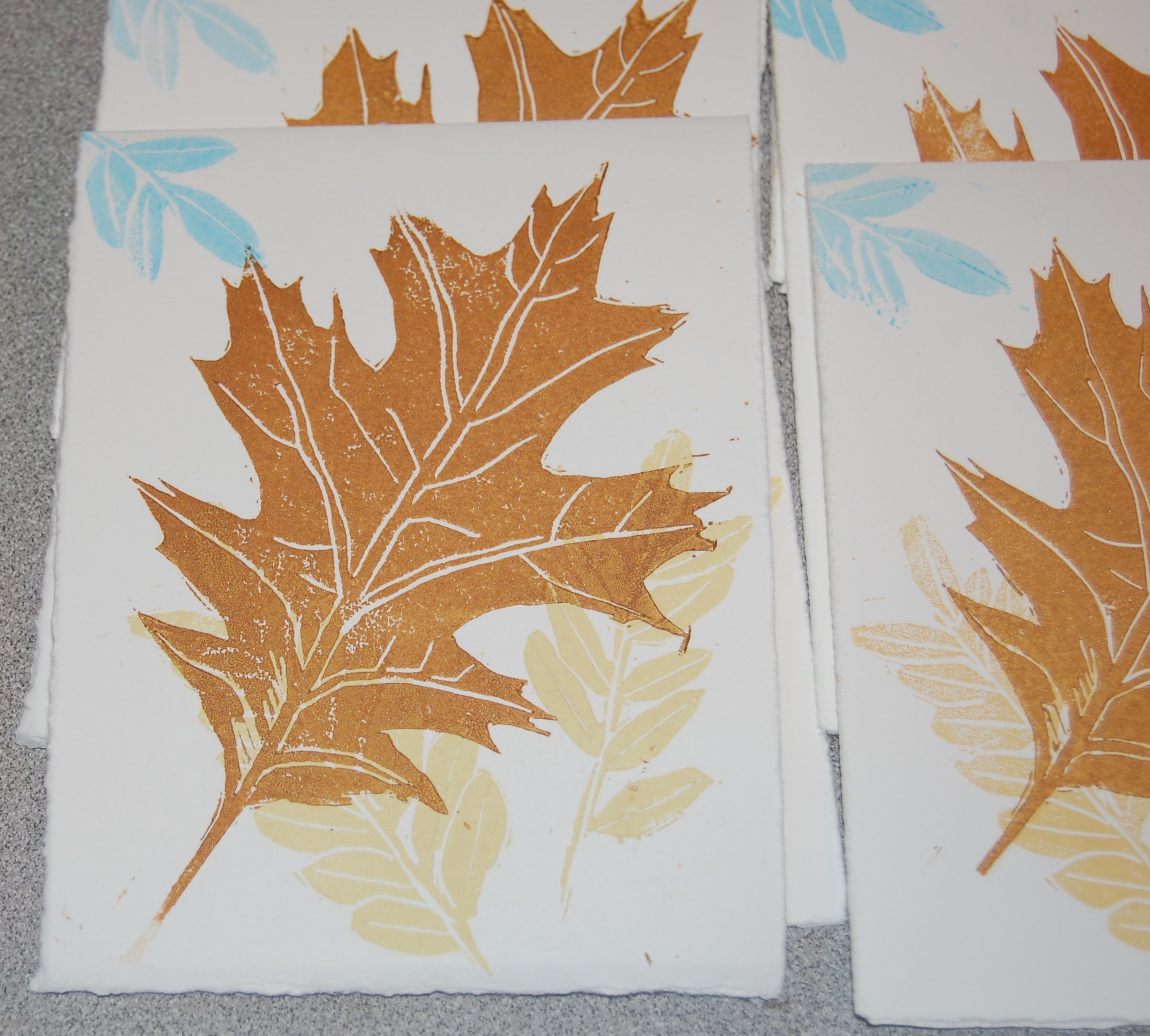 Each of the flowers has a background of a different leaf pattern. Each of the leaves were carved onto a different lino block and printed several times to create a pattern.