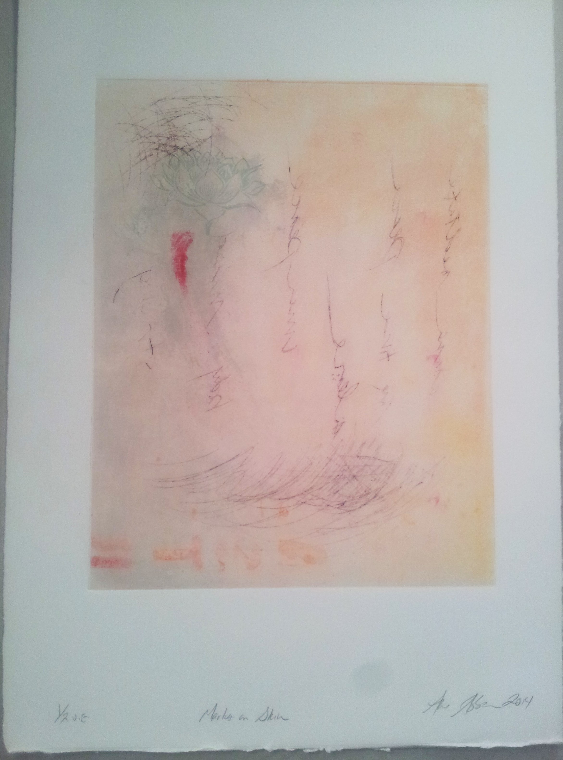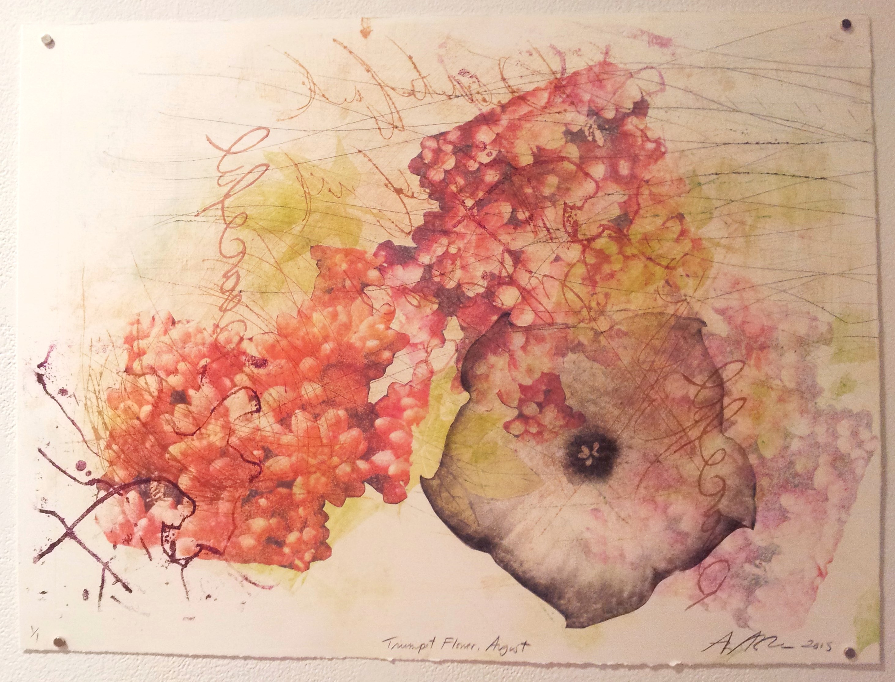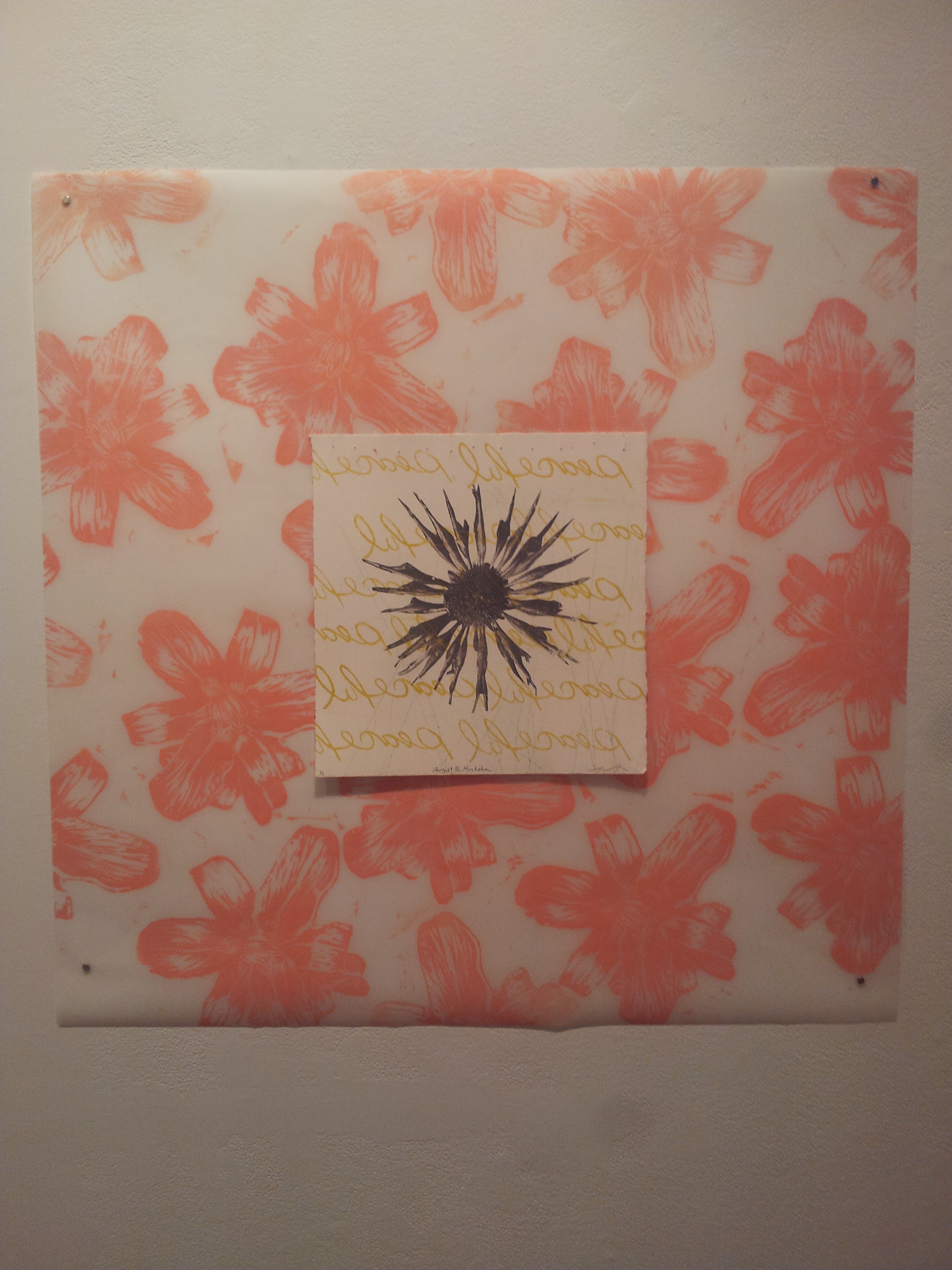 The flowers were taken by myself, on my phone. I call them a protrait becasue it it is a picture of a particular flower at it’s prime. The photos were cropped and optimized and shared with Instagram. The photos were printed, and then photocopied at a magnified resolution. I cut out the photocopied image of the flower and transferred it to paper with an etching press.