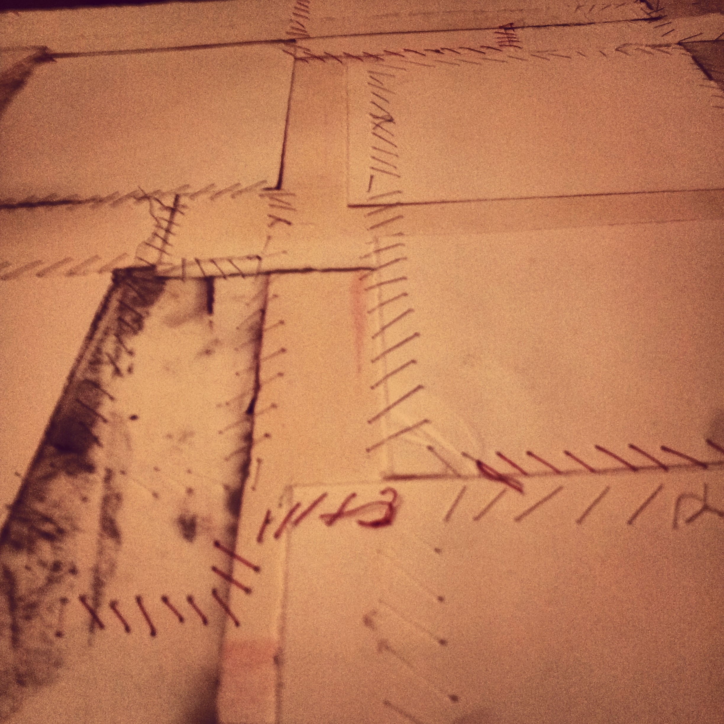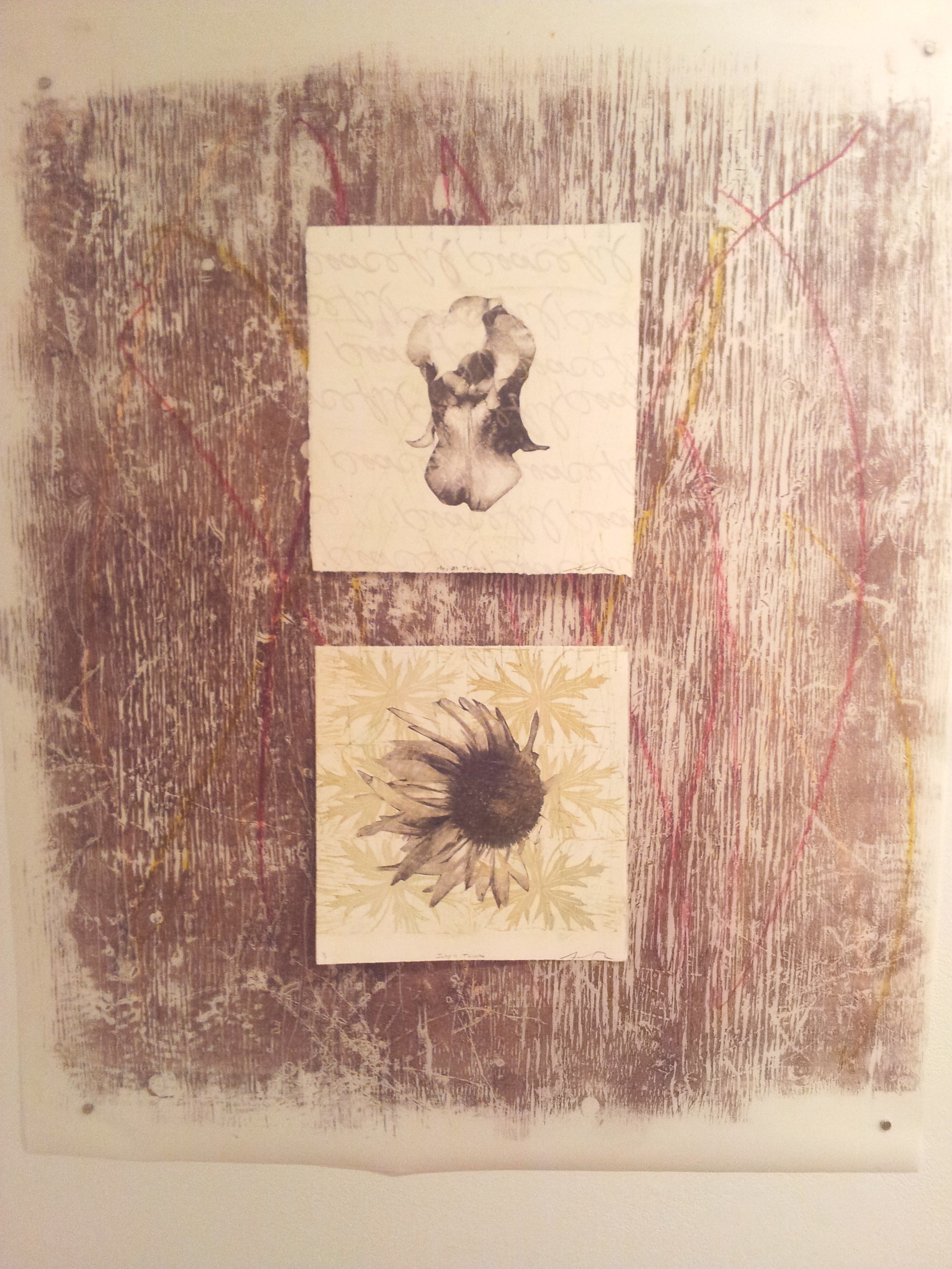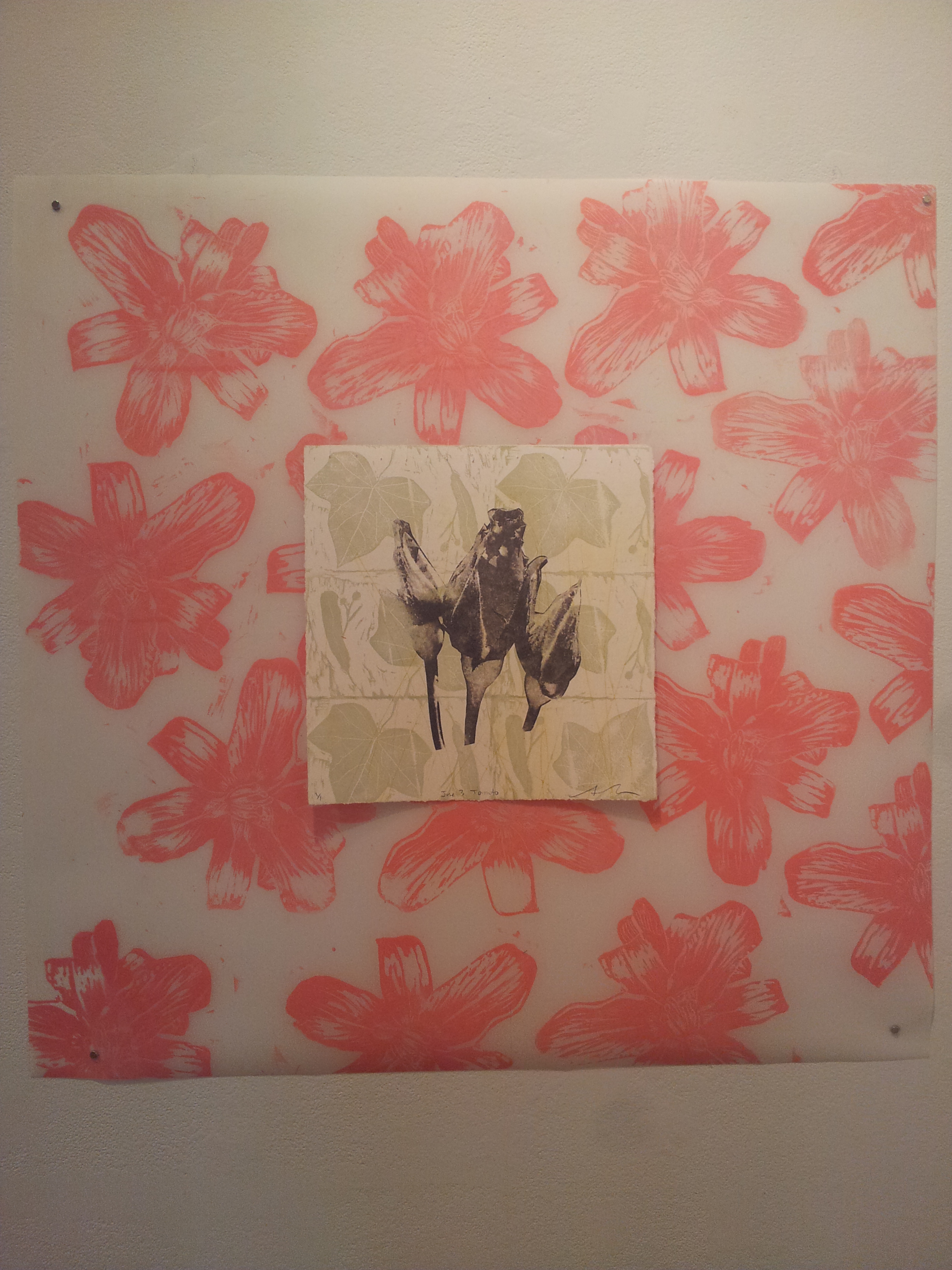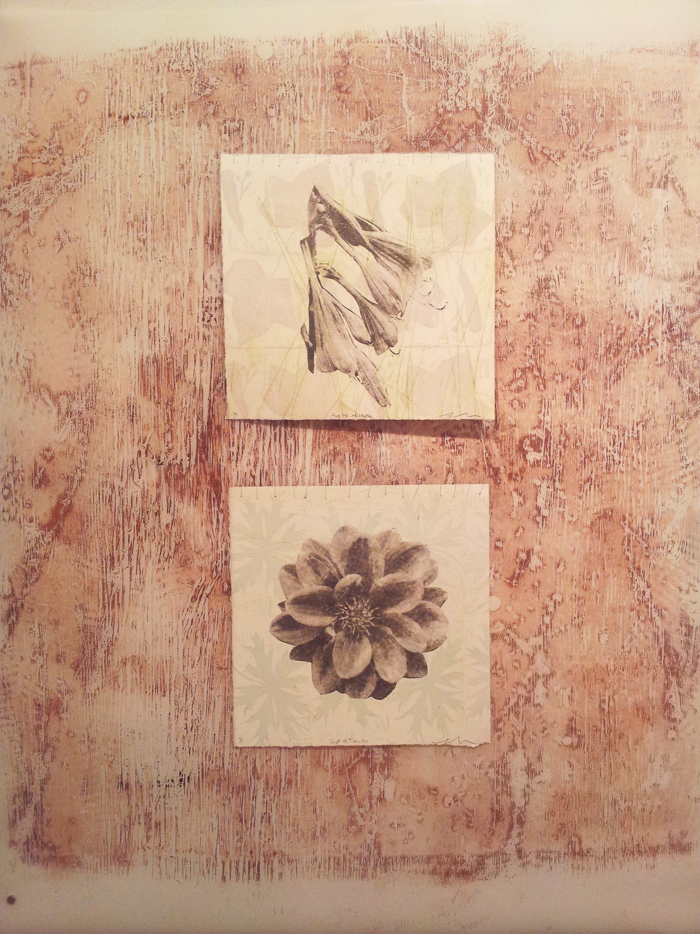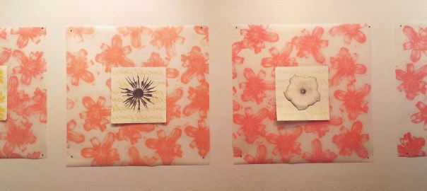 These 3 large woodcuts on mylar each have 2 flower portraits sewn on to them.