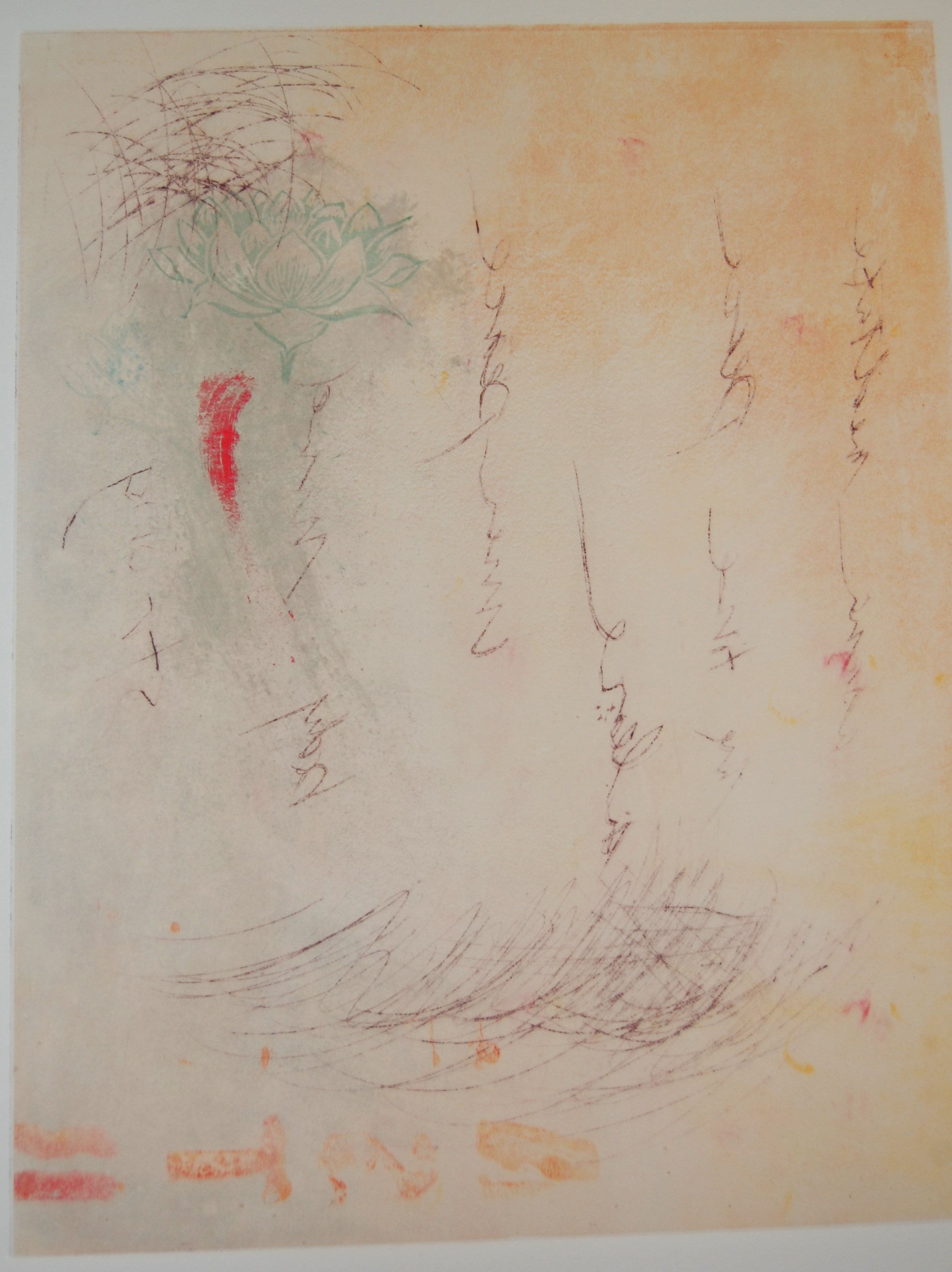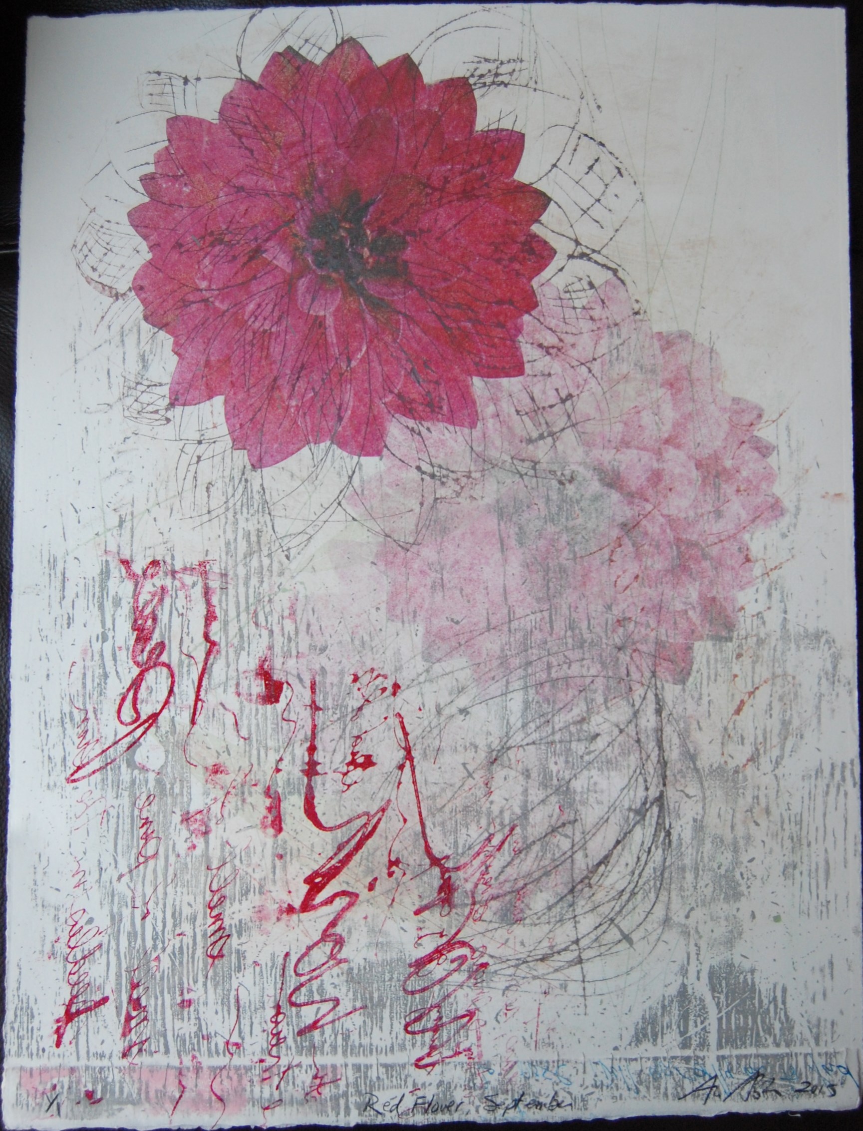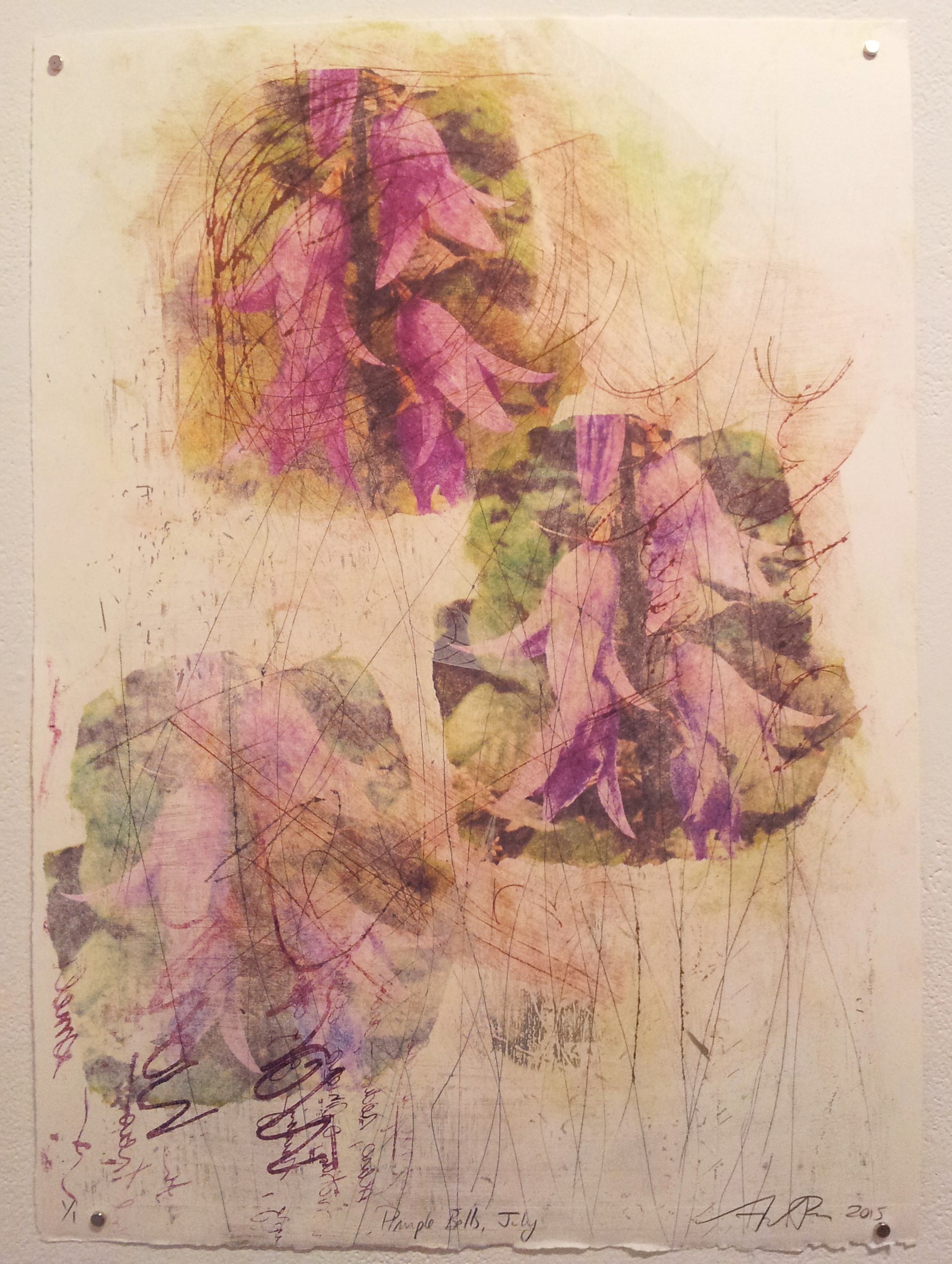 The vertical lines on each of the flowers were printed with a drypoint plate. The lines are meant to give a sense of movement and dynamism.
