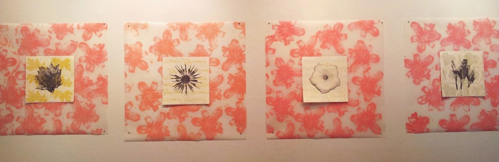 Moments in Time utilizes the type of spontaneous images made possible by the ubiquity of smartphones. In my daily life, I am often on foot and take the opportunity to notice the day-to-day changes the seasons bring in the lawns and gardens of my neighbourhood. When I see a flower in bloom, or brightly coloured fall leaves, things that appear so temporarily, I capture these images in their prime, and crop and edit them to highlight their unique beauty. Now a permanent record of the temporary beauty exists; close up, cropped and singled out. Translating the images from a photograph to a print by using the photocopy transfer process gives the images a softer and more delicate quality. Layering and collaging these with linocut images of other foliage, pieces of older prints, and passages of text and maps suggests memories, keepsakes, or pages from a journal. Hand sewing the collages together physically joins the paper while the stitches add colour and texture.